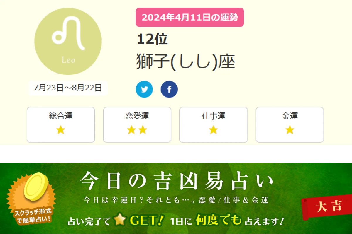 血液型占いやタロットなどの占いをゲーム感覚でプレイすることができるコンテンツです。あなたの今日の運勢や星座ランキングなどもページ内に設置しております。